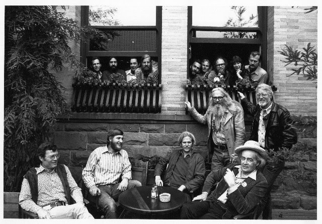 George Hitchcock and other area poets outside Cooperhouse, Santa Cruz, CA The windows, left to right: Steve Levine, Victor Perera, James B. Hall, T. Mike Walker, Peter Beagle, Robert Lundquist, Morton Marcus, Anne Steinhardt, James D. Houston. Standing from left: William Everson, Mason Smith; Seated from left: John Deck, Lou Matthews, Nels Hanson, George Hitchcock. Photo by Gary Griggs |